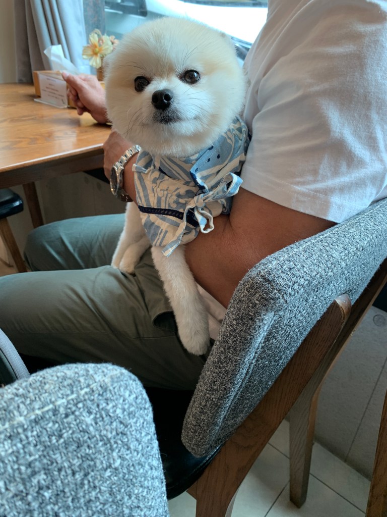 第二天早上在吃早餐時被隔壁桌的狗狗舔了,超可愛的松鼠博美,好乖的狗狗。