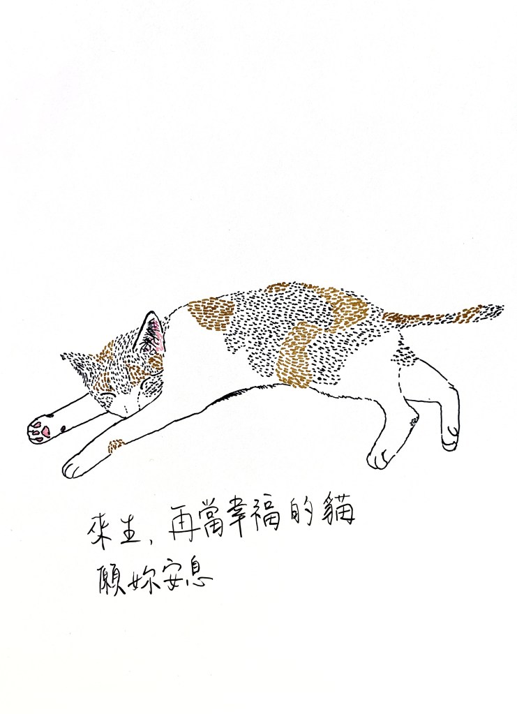 發表於 Doodles 塗鴉:願妳安息 發表於2022-05-172022-05-18 由Ran撰寫 前任上午突然傳來訊息 說他其中一隻貓因為胰臟炎過世了 其實一邊覺得他不該告訴我這件事情,但一邊又回憶起和那隻貓貓相處的時光。 是隻年輕又調皮的貓,和我相處時大概才兩三歲,現在分手都三年了⋯⋯也是隻熟齡貓貓了,但離去還是太早了。 於是畫了她,紀念我們兩年的相處。 看了幾張過去的照片,眼淚很自然地就滑落了,相處過的記憶歷歷在目,那時我還不懂得貓,如果是現在我能對妳們更好的,覺得既愧疚又捨不得。 我只能把這份心用在現任男友的貓貓身上。 如果有來世,希望妳可以再當貓貓,一隻幸福受寵的貓貓。 分享此文: 按一下即可分享至 X(在新視窗中開啟) X 按一下以分享至 Facebook(在新視窗中開啟) Facebook 喜歡 正在載入... 作者: Ran 記錄生活,生活紀錄 View All Posts