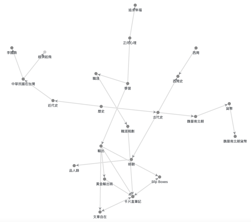 前陣子讀完《卡片盒筆記》便興致高昂地推薦朋友,這真是難得的好書,非常實用地告訴讀者如何達成高生產力的方法,我個人也以書中的方式記錄筆記,相較以往讀書、筆記的方式,確實有效且記憶深刻許多,也嘗試了黑曜石筆記。這是我目前形成的關聯圖: