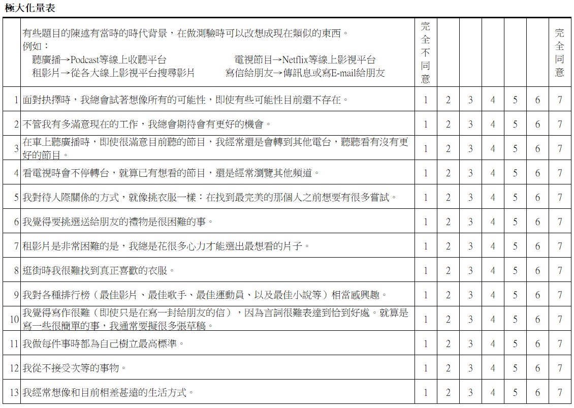 以下13項敘述,同意程度越高就越可能是極大化者。