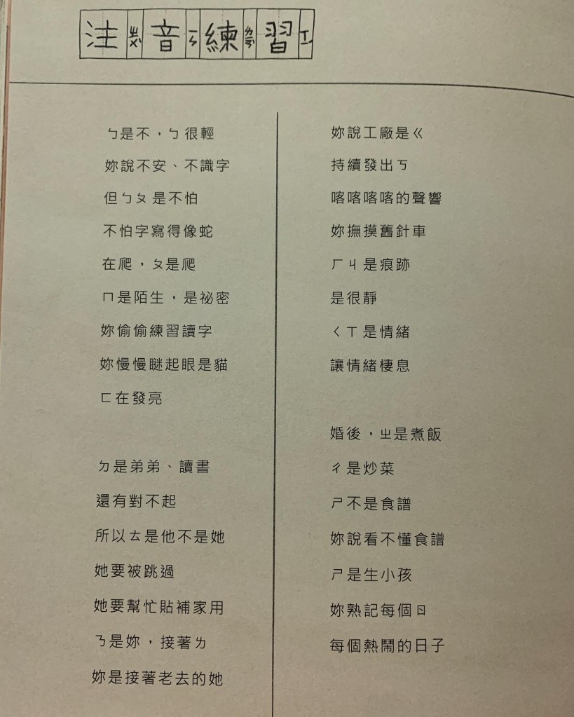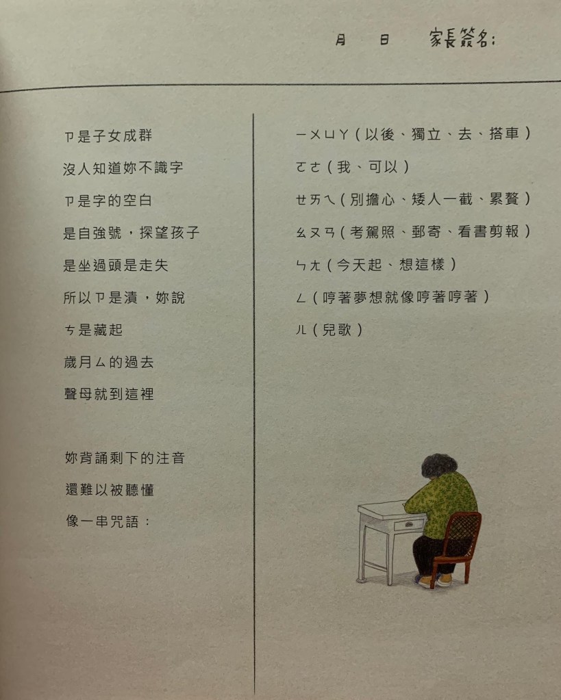 先前朋友推薦我一本繪本《注音符號》,裡頭畫的故事幾乎就是我阿嬤的故事,我想這繪本道出了那個時代一般家庭的女人的處境——為家人奉獻一生。