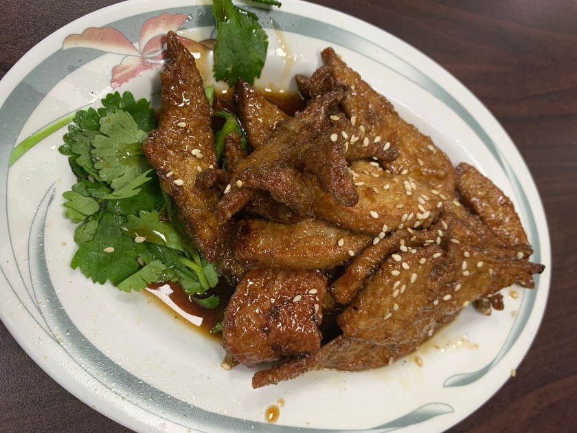 - 煎豬肝:一入口時會被鹹甜的醬汁還有些微酥脆的口感驚艷,但調味過的外皮在咀嚼的過程中先嚥下後,剩下的部分越嚼豬肝原始的味道越鮮明,對於不敢吃豬肝的人來說,這種落差感更可怕。