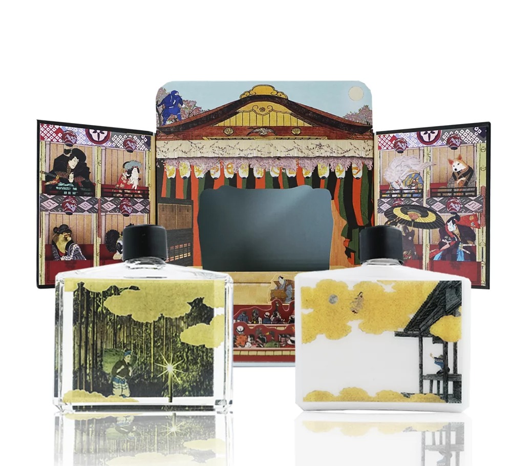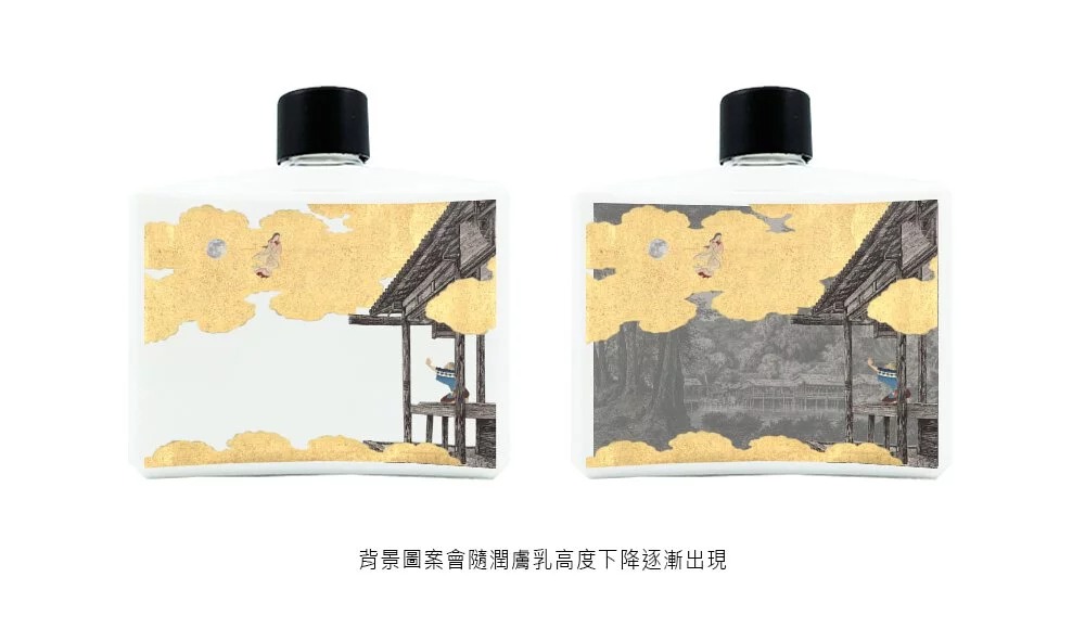 另一區則是將上述的故事製作成劇場禮盒,禮盒裡有沐浴露及潤膚乳(香味和擴香噴霧相同),瓶身內部印有故事圖樣,潤膚乳的圖樣會隨著潤膚乳高度下降逐漸出現。