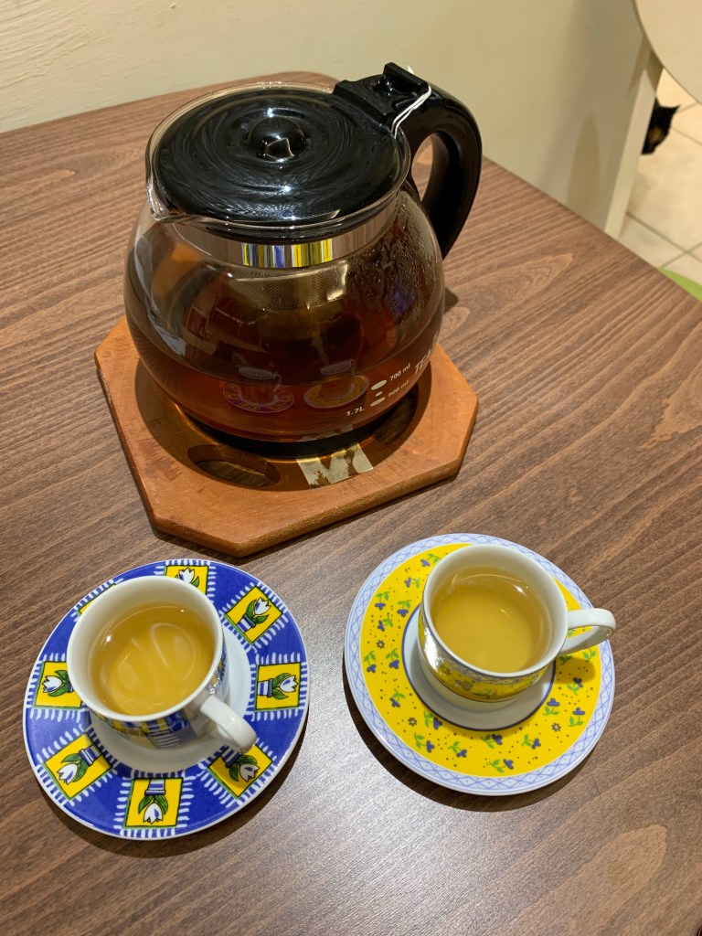 晚上和先生用之前獲得的漂亮茶杯喝著瑪黛牛蒡茶,一邊閒聊,覺得心裡很舒適。