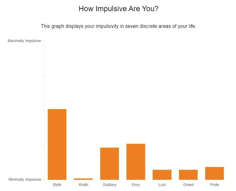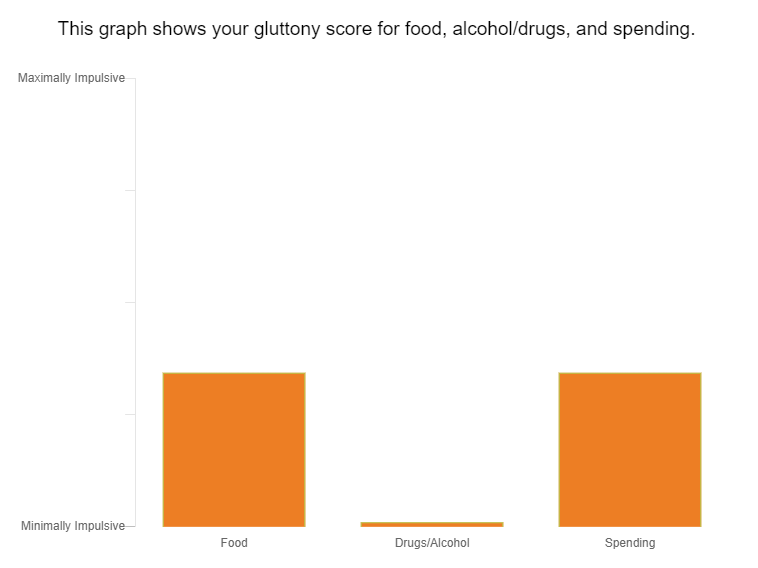 我對食物的貪食得分是34.33;對酒精毒品的貪食是1;對購物方面的貪食(gluttony for consumer goods, purchasing things you don’t really need)是34.33。