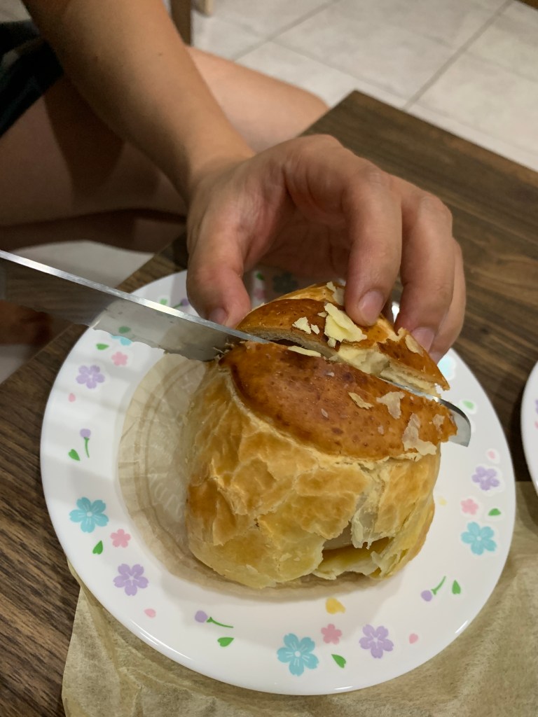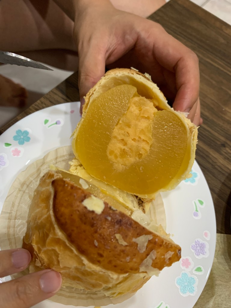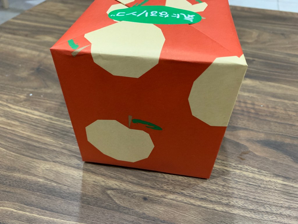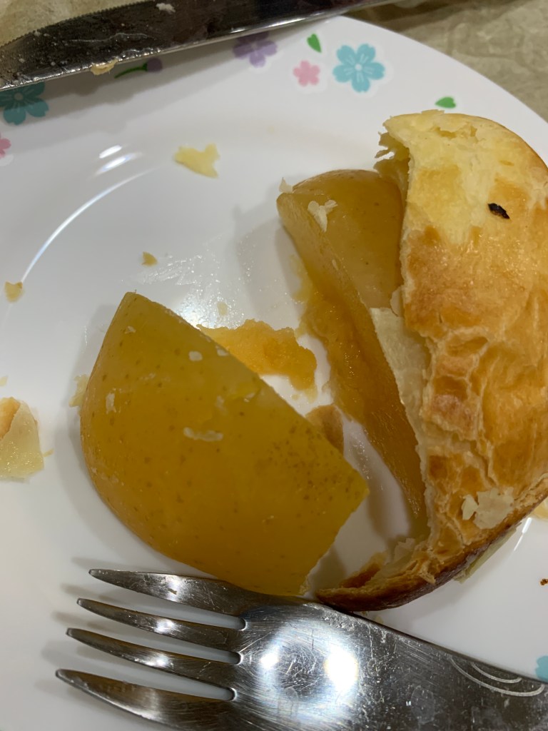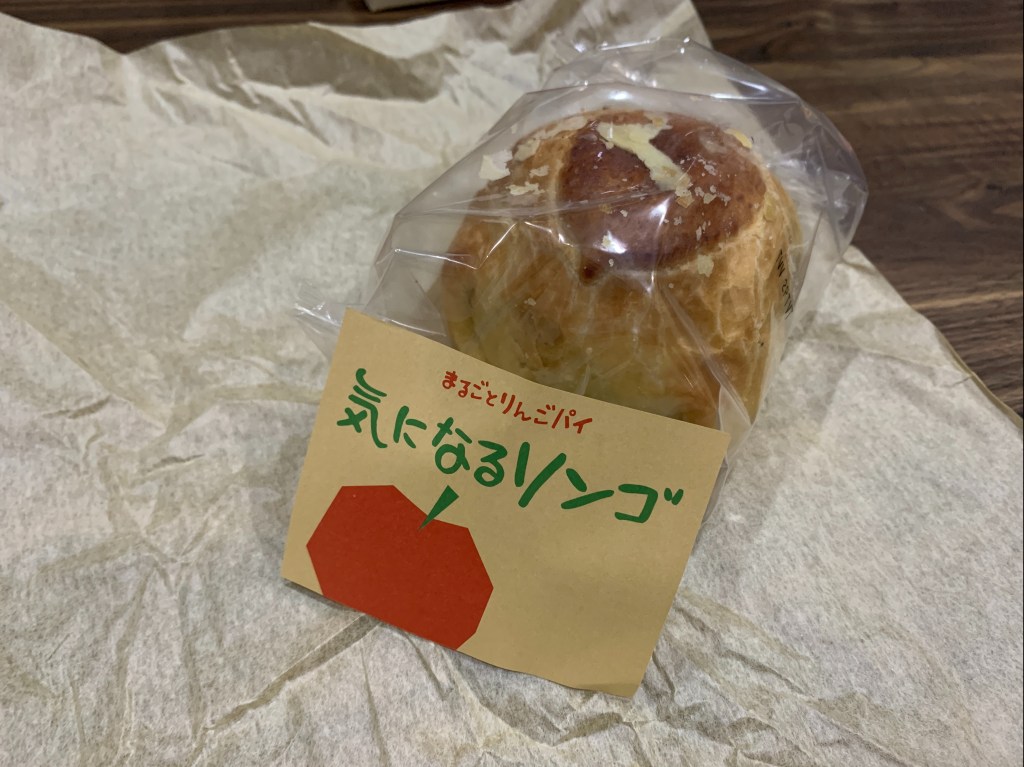 「令人在意的蘋果」是將整顆富士蘋果去芯後,連皮一起浸漬在特製的糖漿中一個月以上,因為蘋果沒有煮過,所以能保留脆脆的口感。酥皮則帶點鹹味,包覆微酸微甜的蘋果,味覺上完全沒有負擔,一個人吃完一整顆也不會膩。不管是常溫還是冰鎮過的都很好吃!