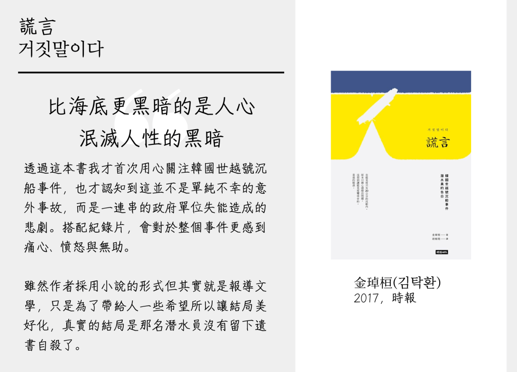 Through this book, I first paid attention to the sinking of the South Korean ferry Sewol and came to realize that it was not simply an unfortunate accident but a tragedy caused by a series of failures within government agencies. When paired with the documentary, one feels even more heartbroken, angry, and helpless about the entire event.