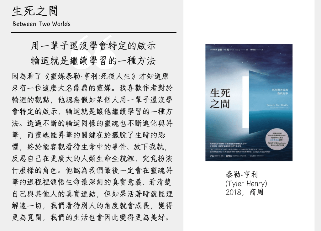 Through watching “Life After Death with Tyler Henry," I discovered the existence of a renowned medium. I appreciate the author’s perspective on reincarnation; he believes that if a person hasn’t learned specific insights in their lifetime, reincarnation serves as a method for them to continue learning. With each cycle of reincarnation, the same soul evolves and ascends. The key to soul ascension lies in shedding the fears of life, finally being able to objectively view life’s events, letting go of attachments, and reflecting on one’s role in the broader scope of human existence. He believes that ultimately, during the process of soul ascension, we will comprehend the deepest truths of life and understand our true connections with others. However, if we can understand all of this while alive, our perspective on others will expand, our lives will become richer, and our existence will become more beautiful as a result.