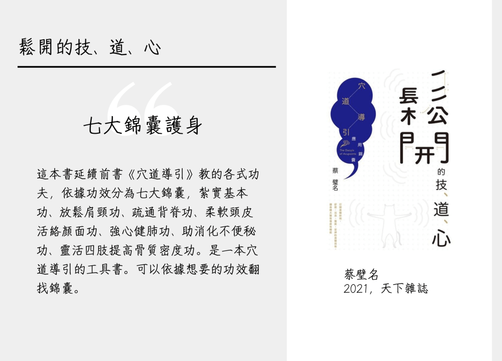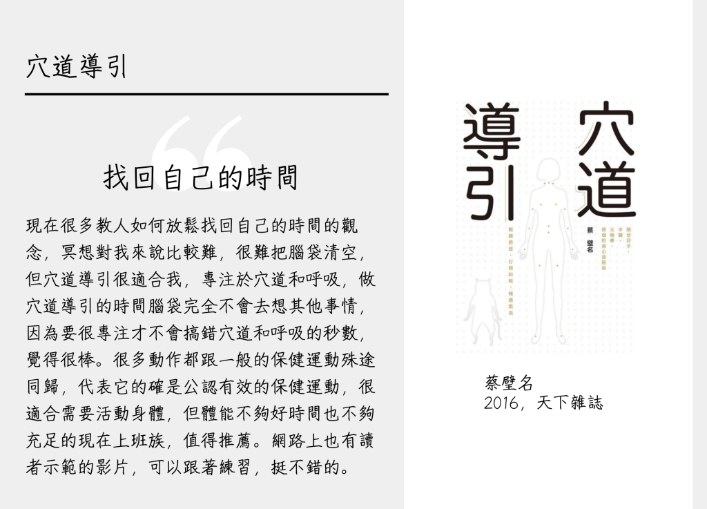 There is a prevalent concept nowadays that teaches people how to relax and reclaim their time. Meditation is quite challenging for me; it’s hard to empty my mind. However, acupressure guiding suits me better. It focuses on meridians and breathing. During the practice, my mind doesn’t wander elsewhere because I need to concentrate to avoid mistaking the timing of the meridians and breaths. It feels great. Many of the movements are similar to general health exercises, indicating its effectiveness as recognized health exercise. It’s suitable for office workers who need physical activity but lack the time and stamina for extensive workouts. It’s worth recommending. There are also demonstration videos online by readers that one can follow along with, which is quite helpful."