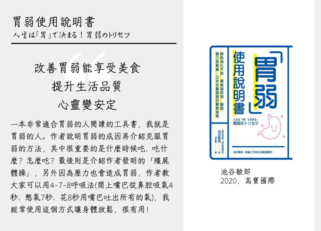 This is a very suitable handbook for people with gastric weakness, and I am one of them. The author explains the causes of gastric weakness and then introduces methods to overcome it, emphasizing the importance of when to eat, what to eat, and how to eat. Finally, the author introduces the “Zombie Exercise" invented by him. Additionally, since stress can also cause gastric weakness, the author teaches readers to use the 4-7-8 breathing technique (inhaling for 4 seconds through the nose, holding the breath for 7 seconds, and exhaling all the air through the mouth for 8 seconds). I often use this method to relax my body, and it’s very effective!