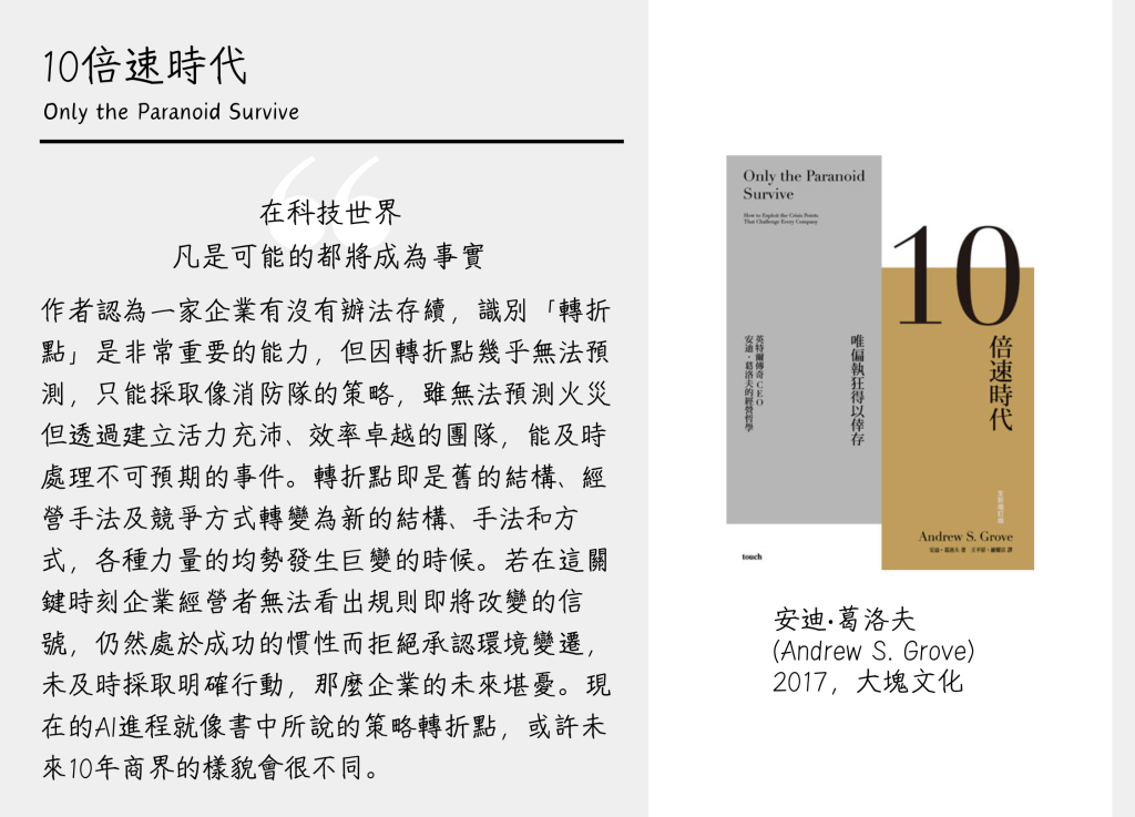 The author believes that the ability to identify “inflection points" is crucial for a company’s survival. However, since inflection points are almost impossible to predict, adopting a strategy akin to that of a fire department is necessary. Just as fire departments cannot predict fires but can deal with unexpected events promptly by establishing dynamic and efficient teams, businesses must be prepared to handle unforeseen circumstances. Inflection points mark the transition from old structures, operating methods, and modes of competition to new ones, occurring when the balance of various forces undergoes significant changes. If business operators fail to recognize the signals indicating that the rules are about to change during these critical moments, and instead cling to the inertia of success, refusing to acknowledge environmental changes and failing to take timely and decisive action, then the future of the business may be in jeopardy. The current progress in AI is akin to the strategic inflection points described in the book, and perhaps the landscape of the business world will be very different in the next 10 years.