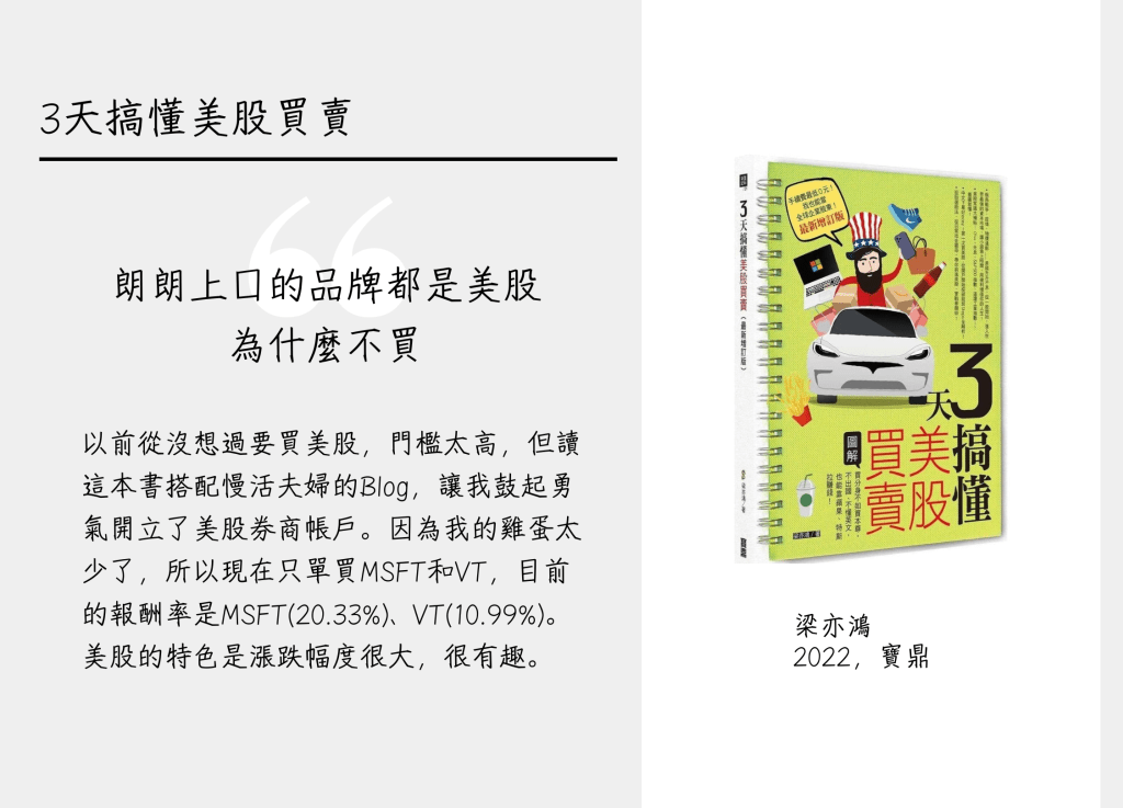 I had never considered buying US stocks before because the barrier to entry seemed too high. However, after reading this book along with the Get Rich Slowly author’s blog, I gathered the courage to open a US stock brokerage account. Since I had limited funds in my pocket, I only purchased MSFT and VT. Currently, the returns are MSFT (20.33%) and VT (10.99%). The characteristic of US stocks is their significant fluctuations, which makes it quite interesting.