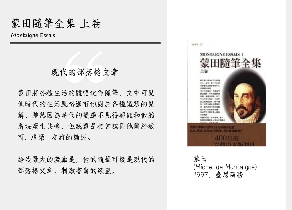 Montaigne turns various life experiences into essays, reflecting his era’s lifestyle and his insights on various issues. While not all of his views may resonate with modern readers due to changes over time, I still strongly agree with his discussions on education, vanity, and friendship.