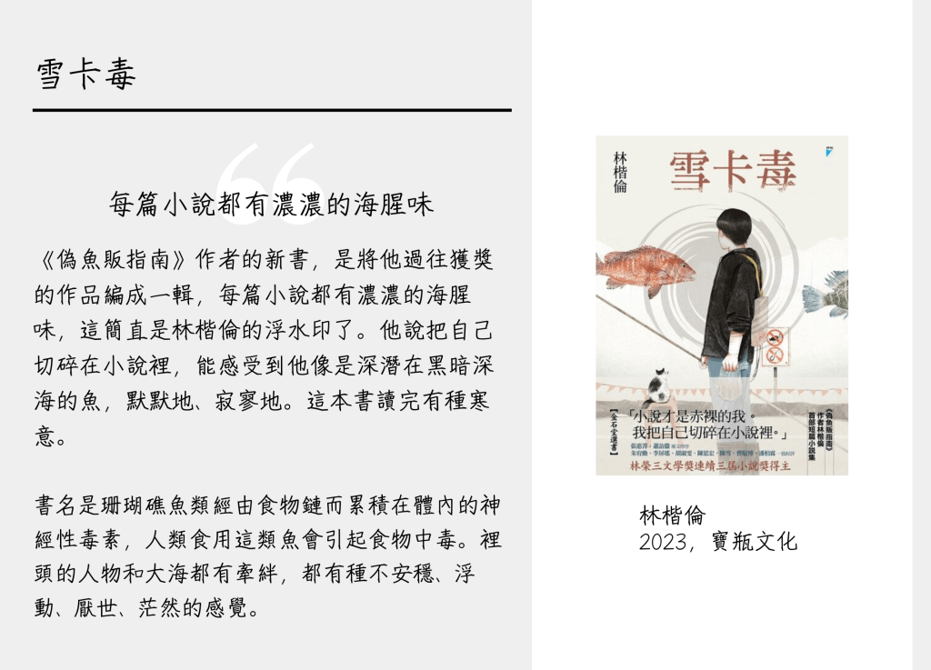 Lin Kailun’s new book, “Ciguatera Fish Poisoning," compiles his award-winning works. Each short story carries a strong sea scent, which is essentially Lin Kailun’s hallmark. He said that by immersing himself in the stories, one can feel as if he were a fish diving deep into the dark sea, silent and lonely. Finishing this book leaves a chilling sensation.