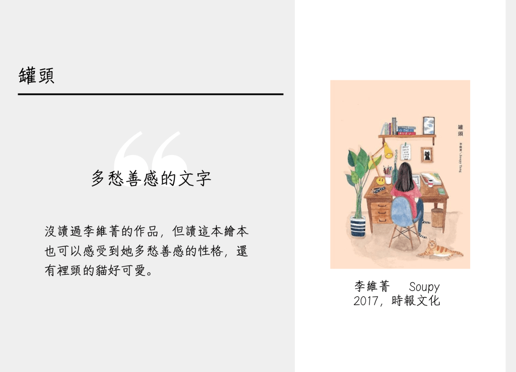 Although I haven’t read any of Li Weijing’s works before, I could feel her tender and sensitive character through this picture book, along with the adorable cat depicted within.