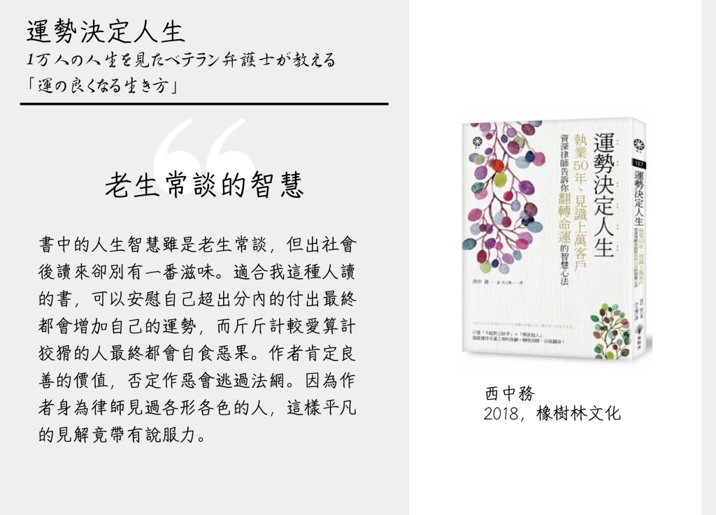 The life wisdom found in the book “How to Improve Your Luck" may seem like old clichés, but reading them after entering society gives them a whole new flavor. It’s the kind of book that resonates with someone like me, offering comfort in the belief that going beyond the call of duty will ultimately enhance one’s luck. Conversely, it warns that those who are overly calculating and deceitful will eventually face the consequences of their actions. The author affirms the values of goodness while refuting the notion that evil deeds can escape punishment. Given the author’s background as a lawyer who has encountered all sorts of people, these seemingly mundane insights carry a persuasive force.