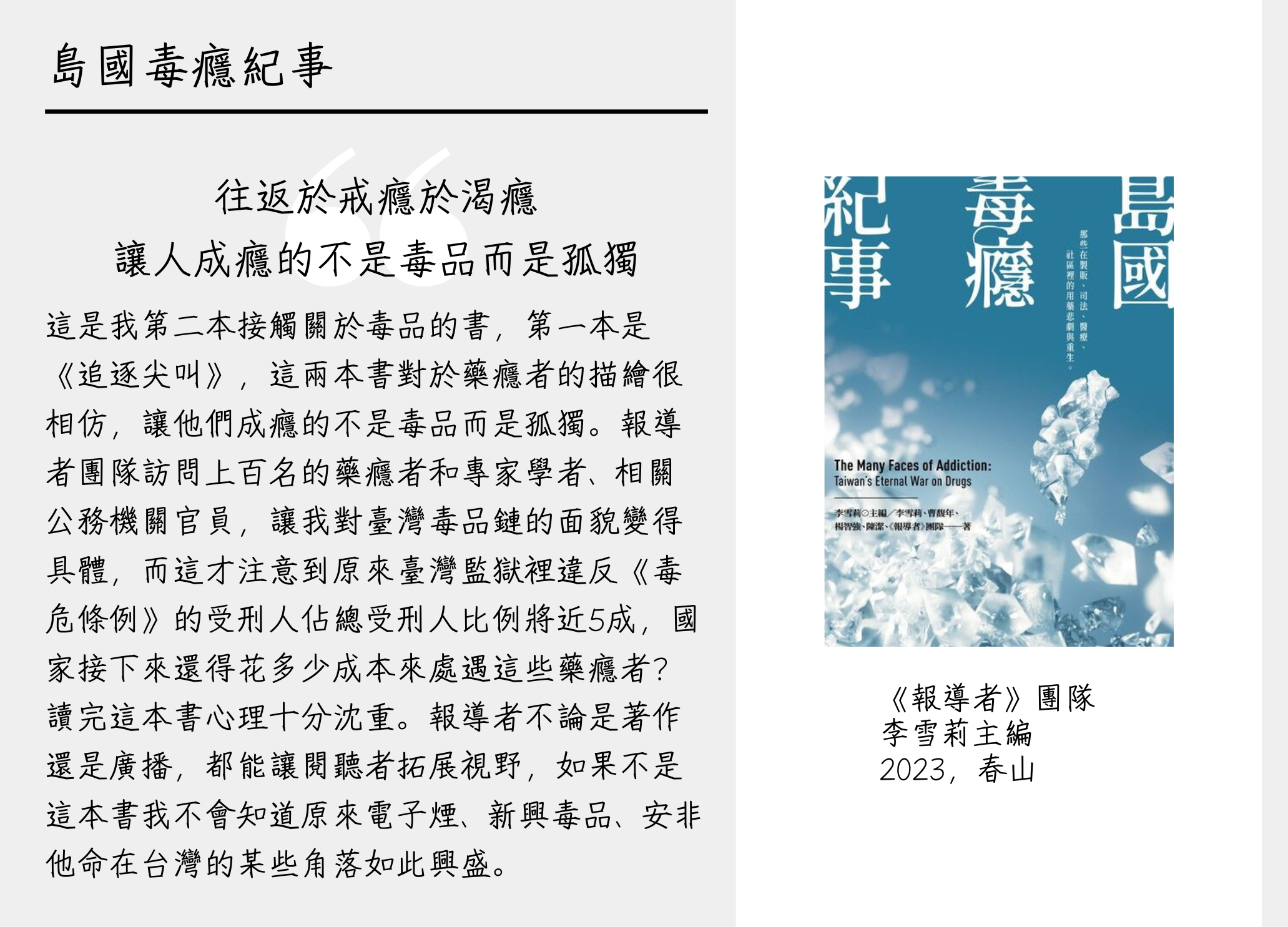 This is my second encounter with books on drug addiction, the first being “Chasing the Scream." Both books depict addiction as stemming not from drugs but from loneliness. The Reporter team interviewed hundreds of drug addicts, experts, scholars, and relevant government officials, providing me with a concrete picture of Taiwan’s drug chain. It was only through this that I realized nearly 50% of inmates in Taiwanese prisons violate the Narcotics Hazard Prevention Act. How much more will the state have to spend to address these addicts? Upon finishing this book, I felt a heavy burden on my mind. The Reporter, whether through their writing or broadcasting, expand the perspectives of their audience. Without this book, I wouldn’t have known about the prevalence of e-cigarettes, emerging drugs, and methamphetamine in certain corners of Taiwan.