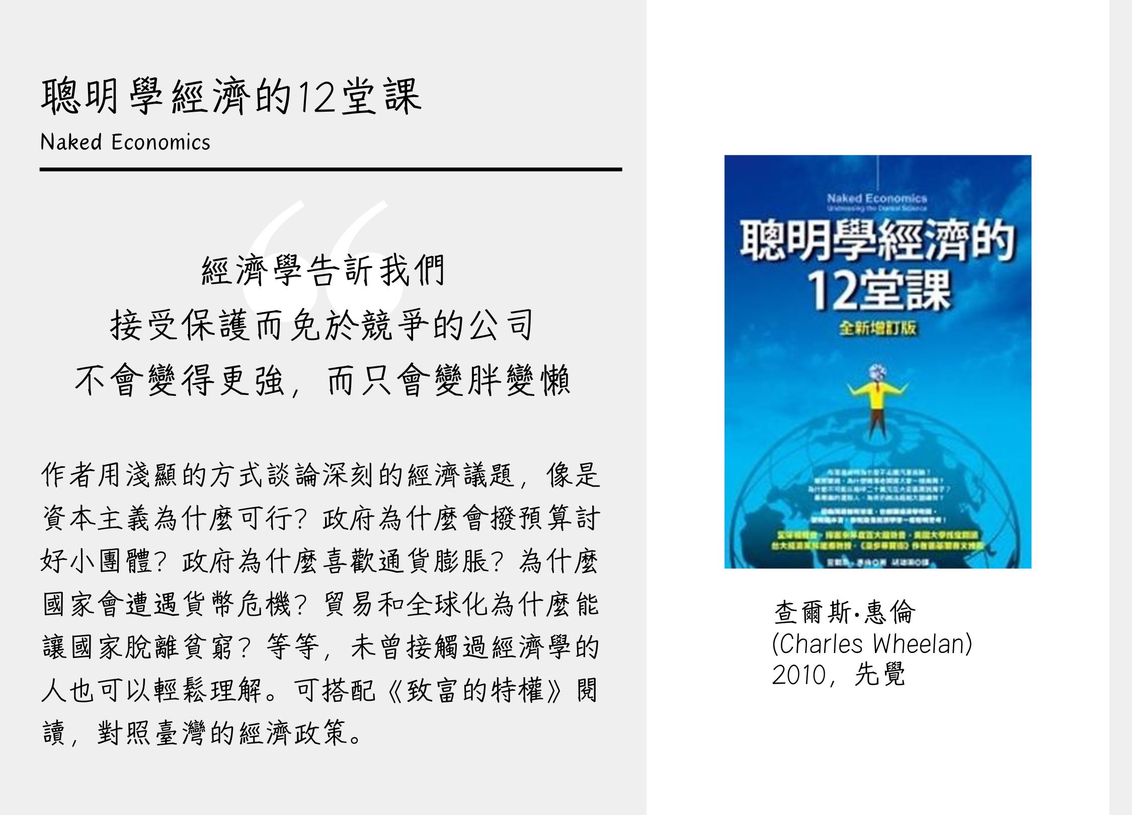 The author discusses profound economic issues in a simple manner, such as why capitalism works, why governments allocate budgets to please small groups, why governments like inflation, why countries encounter currency crises, and why trade and globalization can lift countries out of poverty, among others. Even those who have never encountered economics can easily understand. It can be read in conjunction with “The Privilege of Getting Rich" to compare with Taiwan’s economic policies.