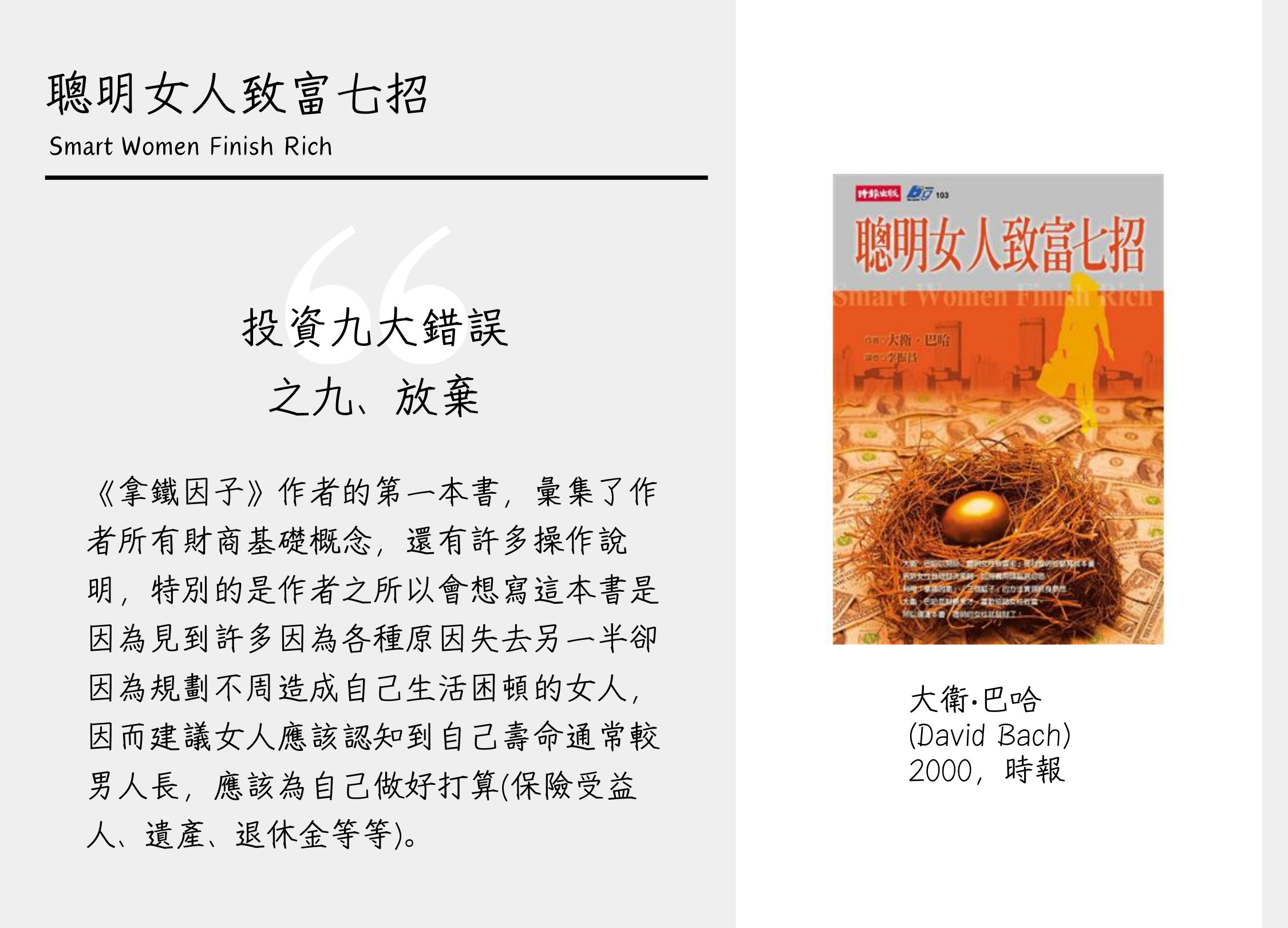 The first book by the author of “The Latte Factor" collects all the author’s basic financial concepts, along with many operational instructions. What’s particularly notable is the reason the author wanted to write this book: after witnessing many women who lost their partners due to various reasons and ended up in financial distress because of inadequate planning, the author suggests that women should be aware that their life expectancy is usually longer than men’s. Therefore, they should make proper arrangements for themselves (insurance beneficiaries, inheritance, retirement funds, etc.).