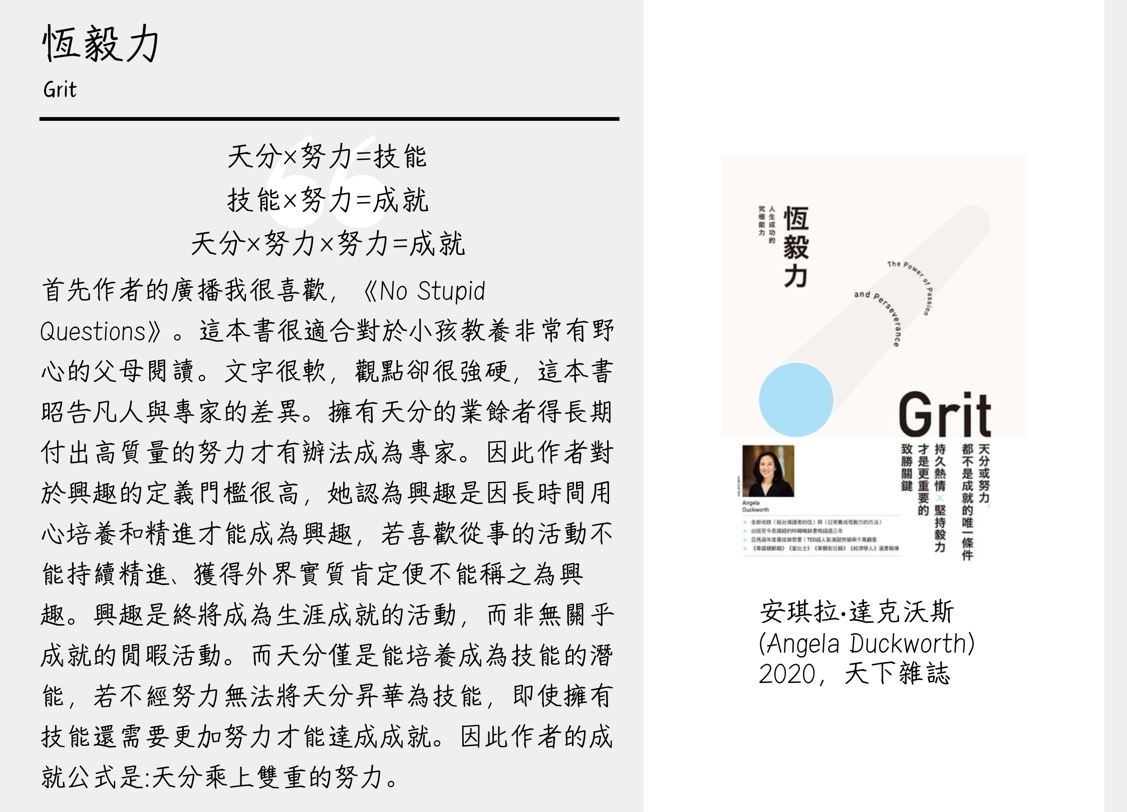 Firstly, I really enjoy the author’s broadcast, “No Stupid Questions". This book is very suitable for ambitious parents who are ambitious about raising their children. The writing style is gentle, yet the viewpoints are firm, clearly delineating the difference between ordinary individuals and experts. Amateur enthusiasts with talent must make long-term, high-quality efforts to become experts. Therefore, the author sets a high threshold for defining interests, believing that interests are cultivated and refined over a long period of dedicated effort. If the activities one enjoys cannot be continuously improved upon or recognized by others, they cannot be considered true interests. Interests are activities that will eventually become career achievements, rather than mere pastimes unrelated to achievements. Talent is merely the potential to develop skills, and without effort, talent cannot be transformed into skill. Even with skills, further effort is required to achieve success. Thus, the author’s formula for achievement is: Talent multiplied by double effort.