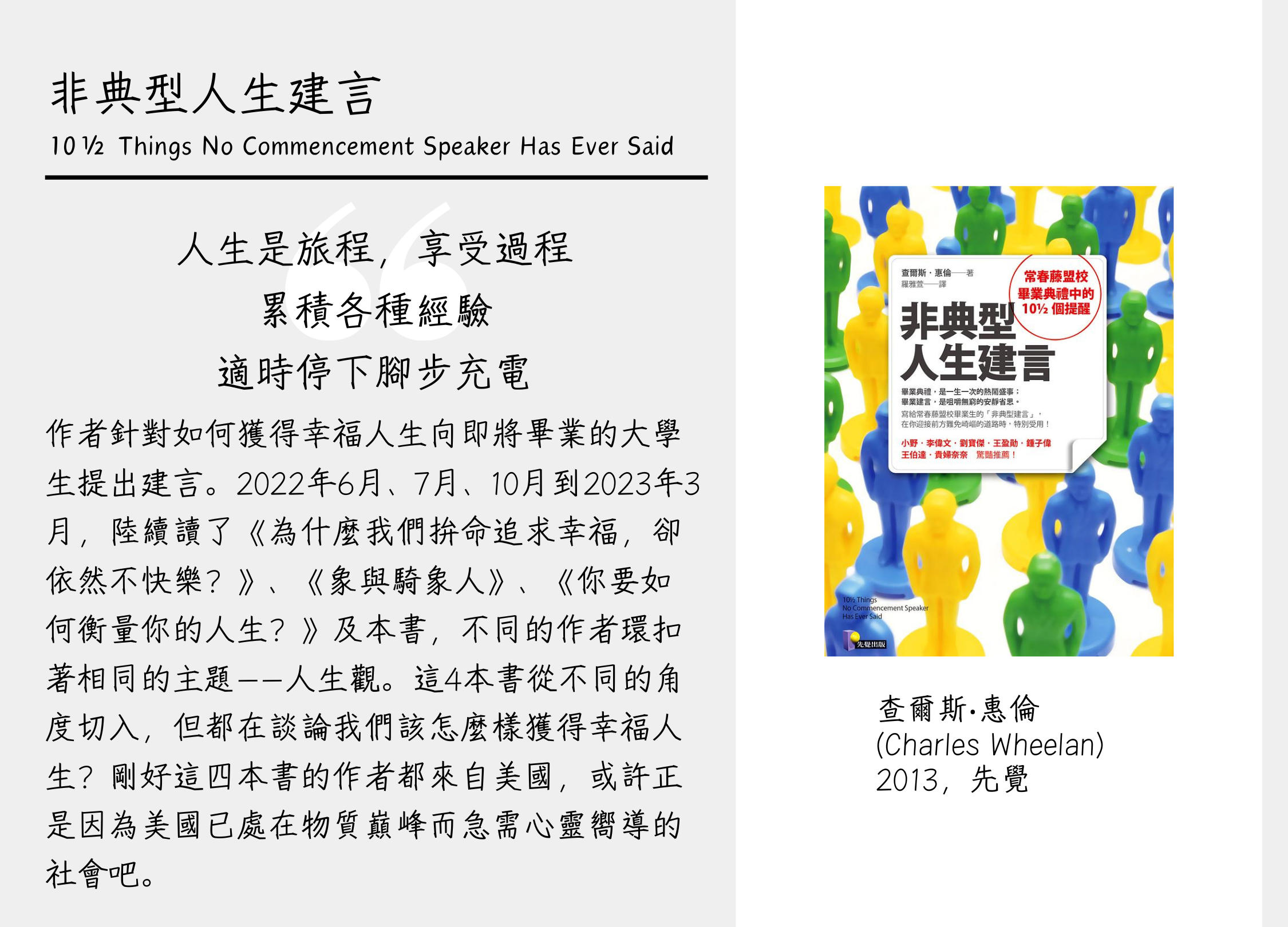 The author offers advice to graduating college students on how to lead a fulfilling life. From June 2022 to March 2023, I sequentially read “America the Anxious," “The Happiness Hypothesis: Finding Modern Truth in Ancient Wisdom," “How Will You Measure Your Life?" and this book, each by different authors but revolving around the same theme – the philosophy of life. These four books approach the topic from different angles but all discuss how to attain a happy life. Interestingly, all four authors are from the United States, perhaps because the United States is already at the pinnacle of materialism and thus in need of spiritual guidance.