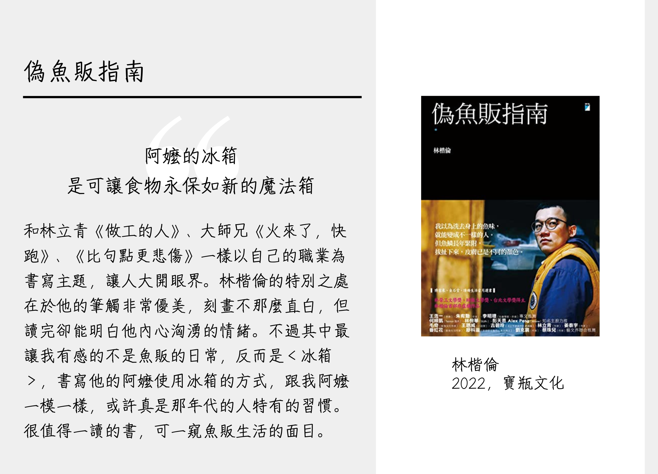 Similar to the works of Lin Linqing’s “Working People," Da Shixiong’s “Fire is Coming, Run Quickly," and “Sadder than Periods," Lin Kailun’s writing revolves around his own profession, offering eye-opening insights. What sets the author apart is his remarkably elegant prose, which depicts scenes not so explicitly but still manages to convey the emotions surging within him. However, what struck me most was not the fishmonger’s daily life but rather the portrayal of the “Refrigerator." The depiction of his grandmother’s use of the refrigerator mirrors that of my own grandmother, perhaps a unique habit of people from that era. It’s a book well worth reading, offering a glimpse into the life of a fishmonger.
