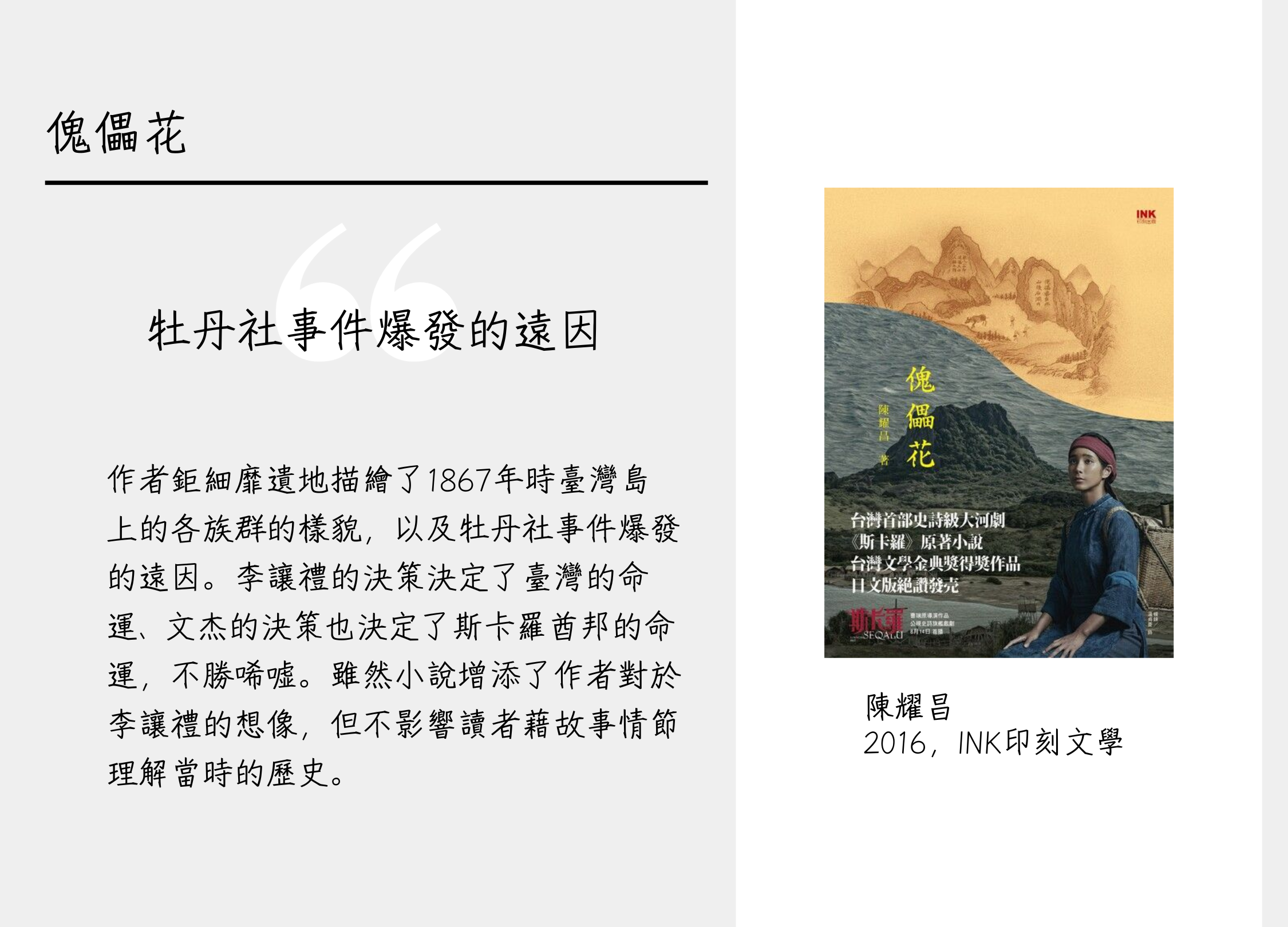 The author meticulously portrays the various ethnic groups on the island of Taiwan in 1867, as well as the underlying causes of the Mudan Incident. The decisions made by Charles W. Le Gendre determined the fate of Taiwan, while Jagarushi Guri Bunkiet’s decisions also determined the fate of the Seqalu tribe, which is deeply regrettable. Although the novel adds the author’s imagination regarding Charles W. Le Gendre, it does not detract from readers’ understanding of the historical context through the storyline.