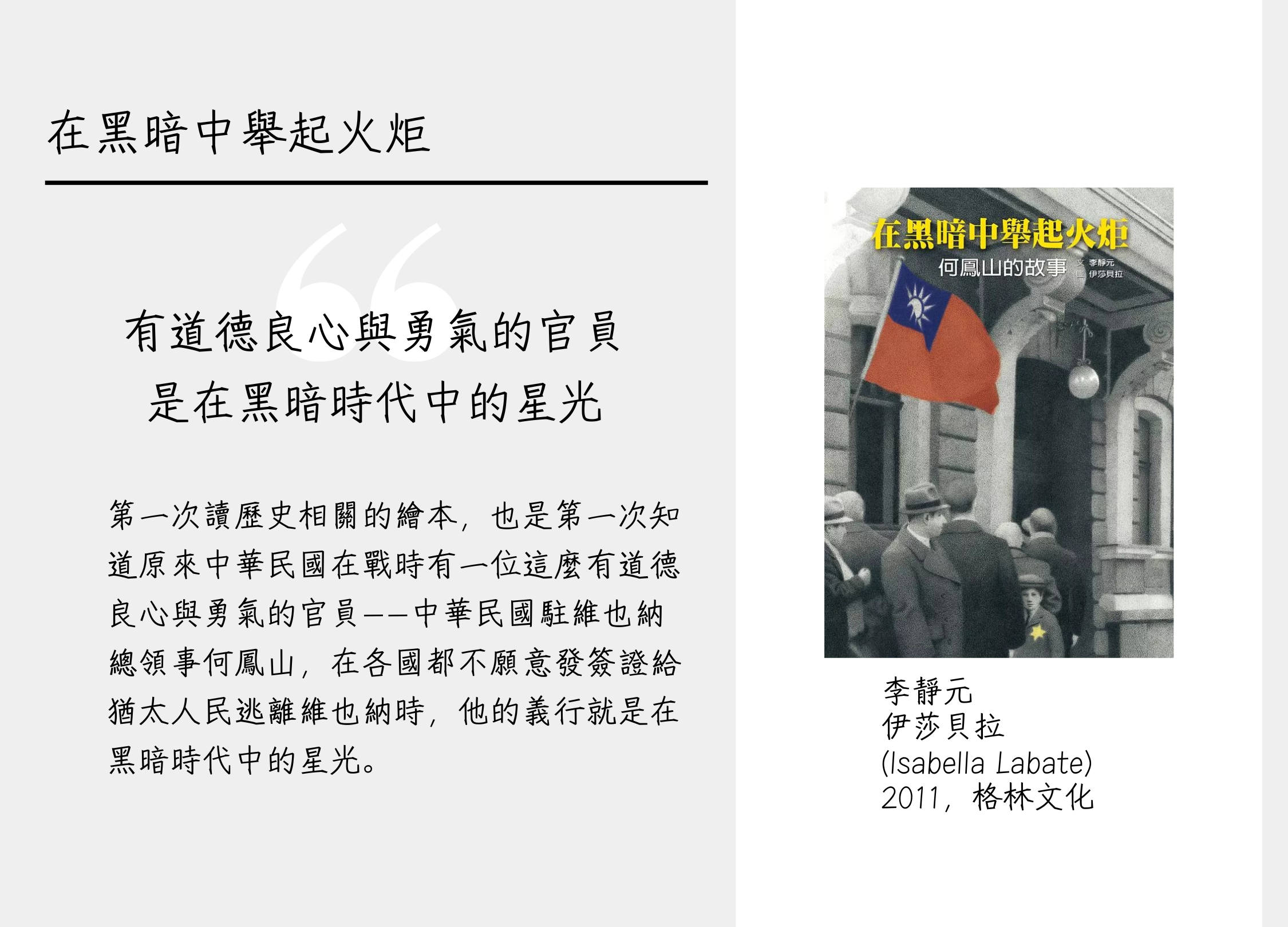 This is the first time I’ve read a history-related picture book, and it’s also the first time I’ve learned that during wartime, the Republic of China had such a morally conscientious and courageous official – Ho Fengshan, the Consul General of the Republic of China in Vienna. When other countries were unwilling to issue visas to Jewish people fleeing Vienna, his acts of righteousness were like stars shining in the darkness of that era.