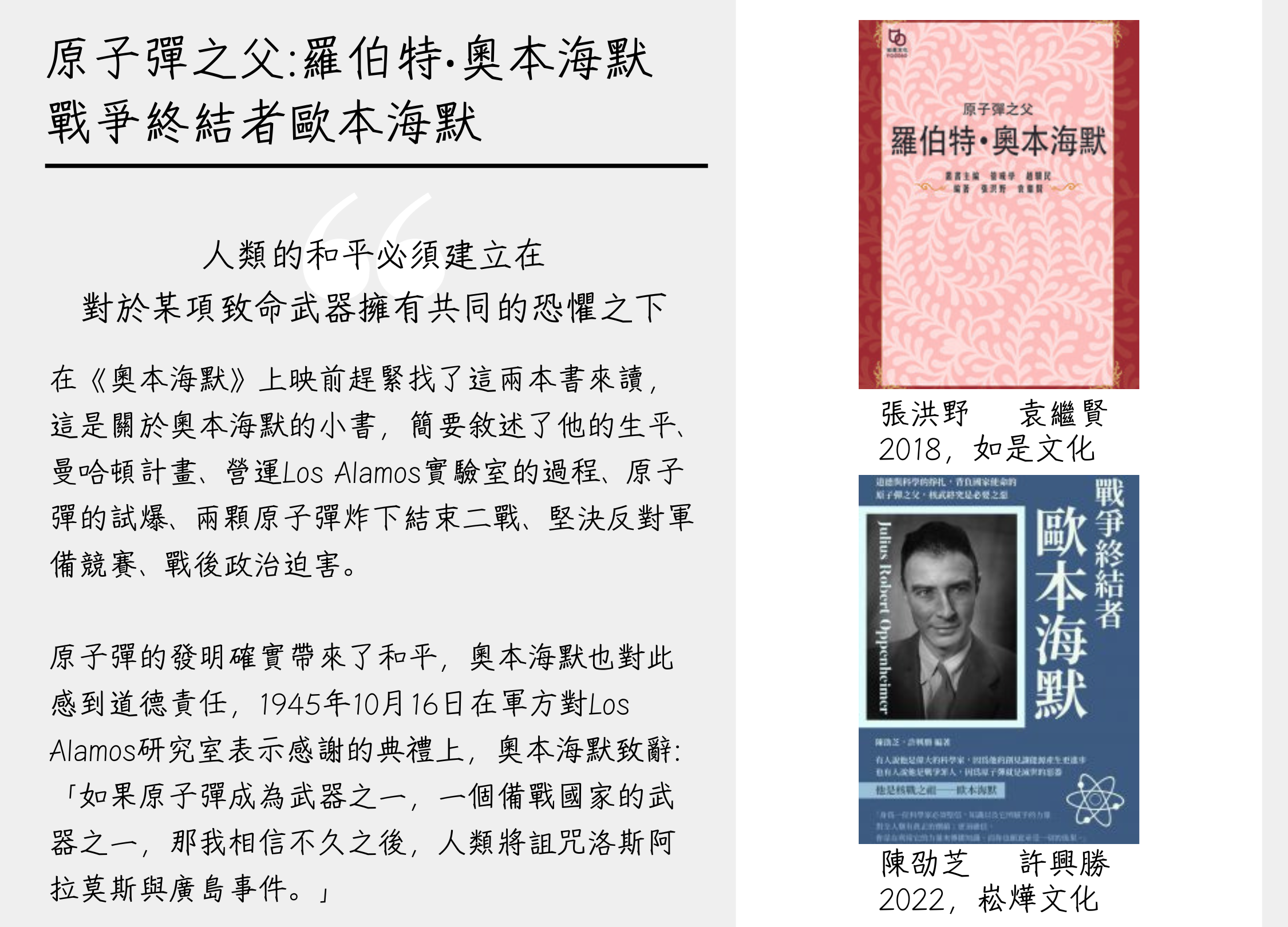Before the release of “Oppenheimer," I hurried to find these two books to read. They provide a brief account of Oppenheimer’s life, the Manhattan Project, the operation of the Los Alamos laboratory, the testing of the atomic bomb, the end of World War II with the dropping of two atomic bombs, his staunch opposition to the arms race, and the post-war political persecution he faced.
