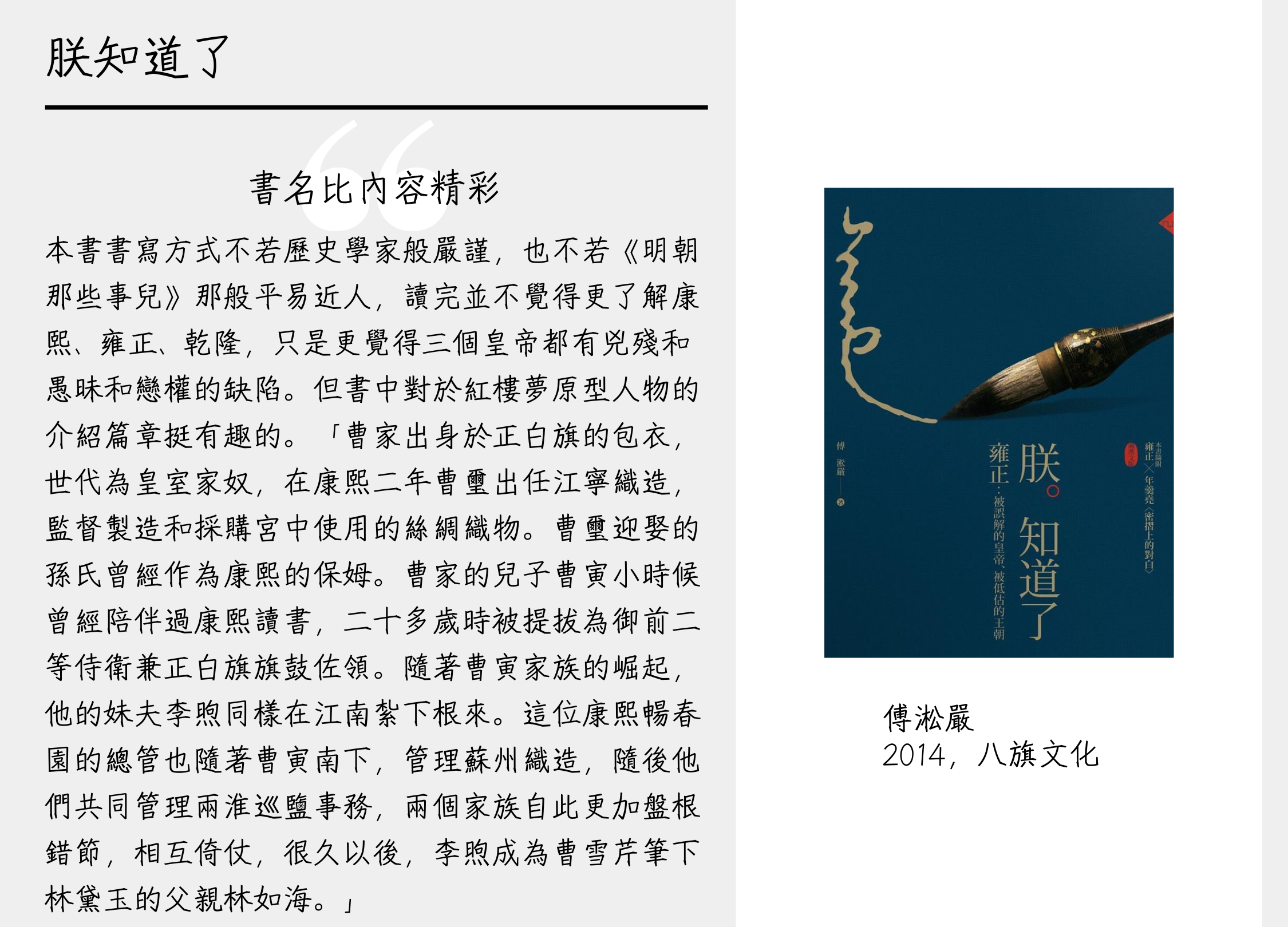 The writing style of this book is not as rigorous as that of a historian, nor as approachable as “Those Things in Ming Dynasty." After reading it, I do not feel a deeper understanding of Kangxi, Yongzheng, or Qianlong, but rather a recognition that all three emperors had their flaws of cruelty, ignorance, and a lust for power. However, the chapters introducing the prototype characters of the Dream of the Red Chamber are quite interesting. “The Cao family originated from the Bannermen of the Plain White Banner, serving generations as servants to the imperial family. In the second year of Kangxi’s reign, Cao Xi was appointed as the supervisor of weaving in Jiangning, overseeing the production and procurement of silk fabrics used in the palace. The wife welcomed by Cao Xi, Sun, had previously served as a nursemaid to Kangxi. Cao Yin, the son of the Cao family, accompanied Kangxi in his childhood studies and was promoted to second-grade Imperial Guard and Deputy Leader of the Plain White Banner at the age of over twenty. As the Cao family rose, his brother-in-law Li Xu also established himself in Jiangnan. This manager of Kangxi’s Changchun Garden also followed Cao Yin southward to manage weaving in Suzhou. Subsequently, they jointly managed the salt affairs in the two Huai regions. The two families thus became intricately intertwined, relying on each other. Much later, Li Xu became Lin Daiyu’s father Lin Ruhai in Cao Xueqin’s portrayal."