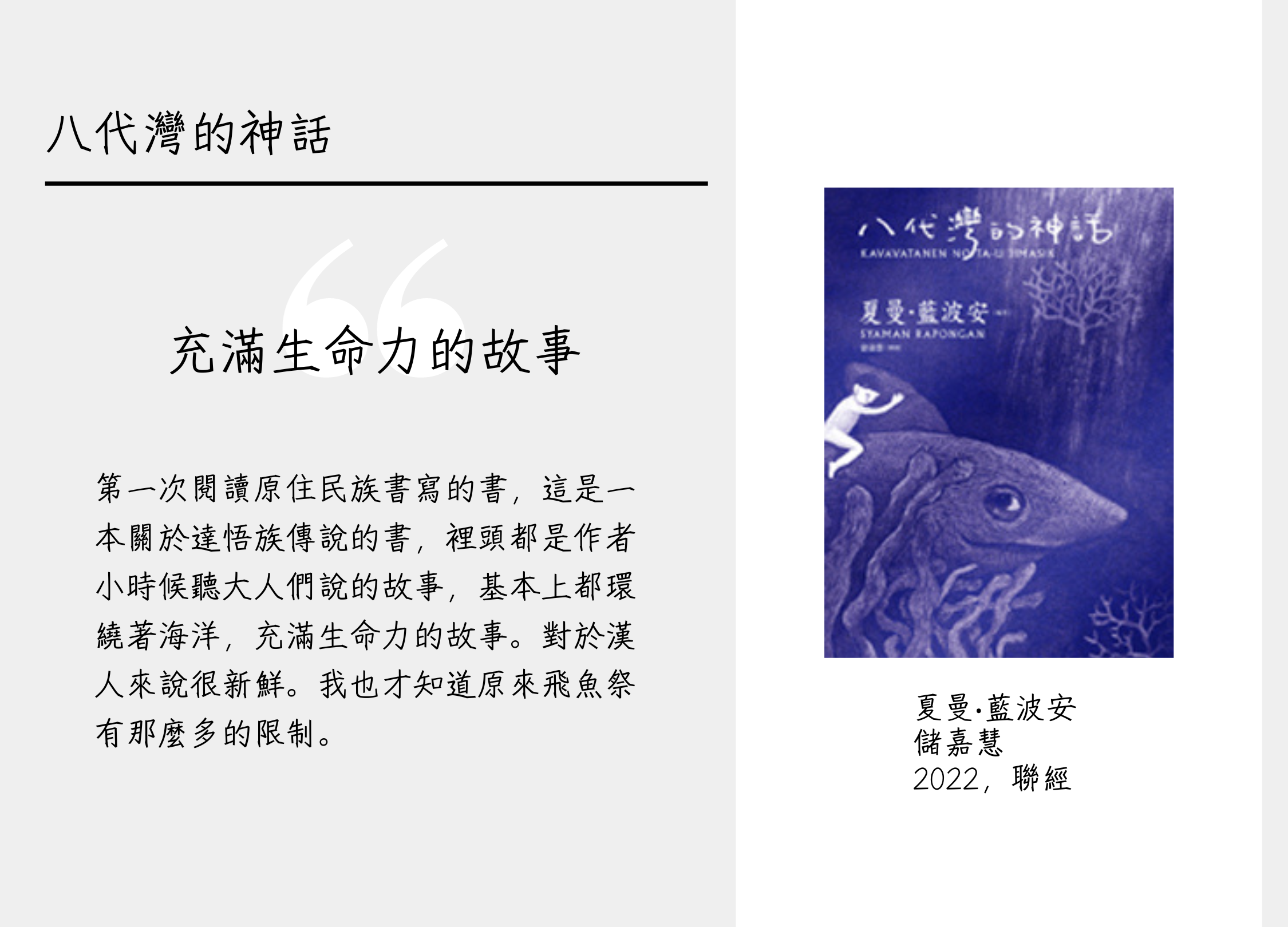 This is the first time I’ve read a book written by an indigenous author. It’s a book about Tao mythology, filled with stories the author heard from elders in his childhood. These tales mostly revolve around the ocean, presenting narratives brimming with vitality. It’s quite refreshing for someone of Han descent. I also learned that the Flying Fish Festival has so many restrictions.