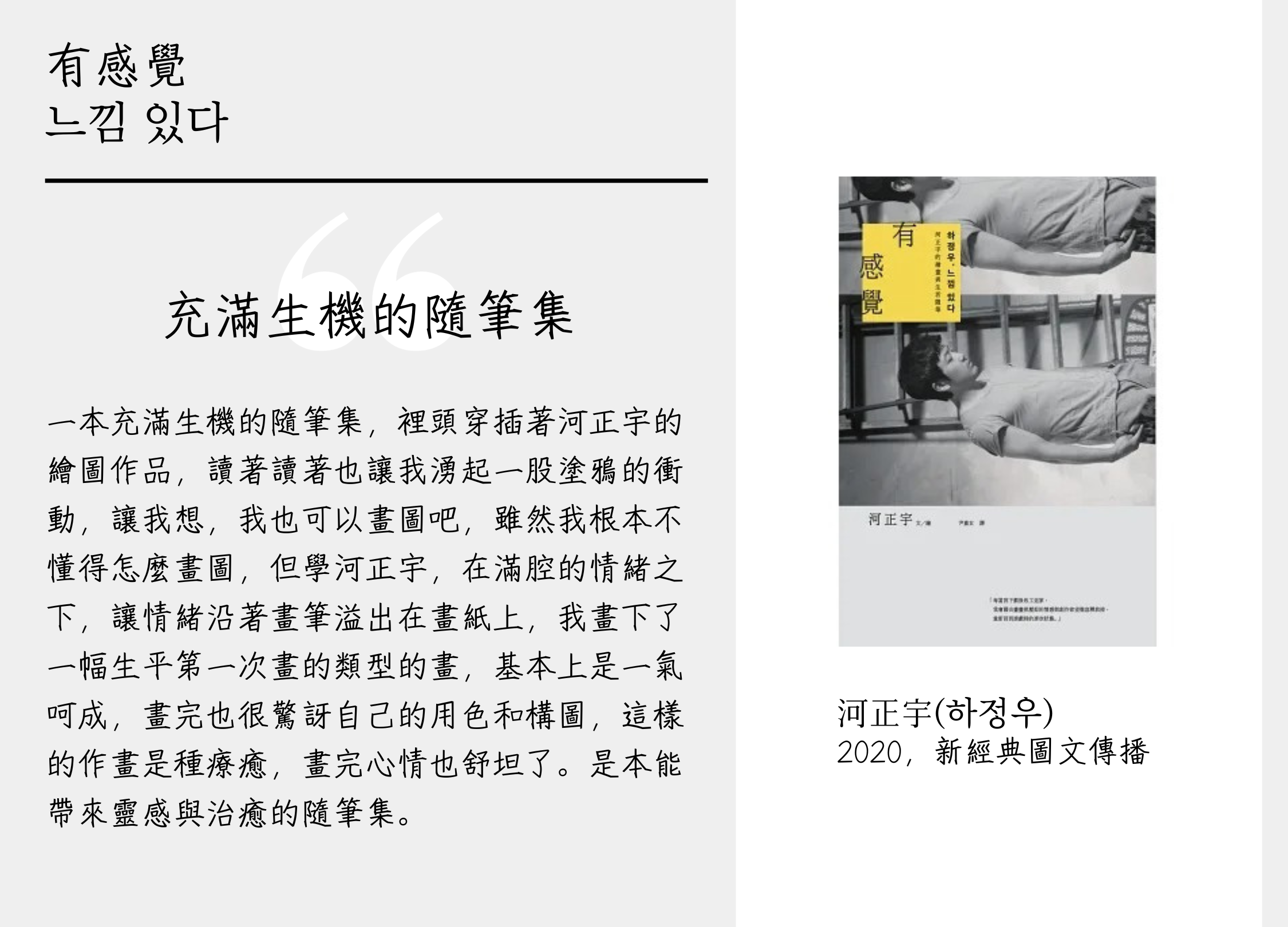 This is a vibrant collection of essays, interspersed with Ha Jung-woo’s artwork. As I read through it, I felt a surge of inspiration to doodle myself. It made me think, maybe I can draw too, even though I have no idea how to. Following Ha Jung-woo’s lead, I let my emotions flow onto the paper through the brush, resulting in my first-ever attempt at drawing. Surprisingly, it turned out quite well, both in terms of color and composition. This kind of drawing is therapeutic; it brought healing, and after finishing, I felt much lighter. It’s a collection of essays that instinctively inspires and heals.