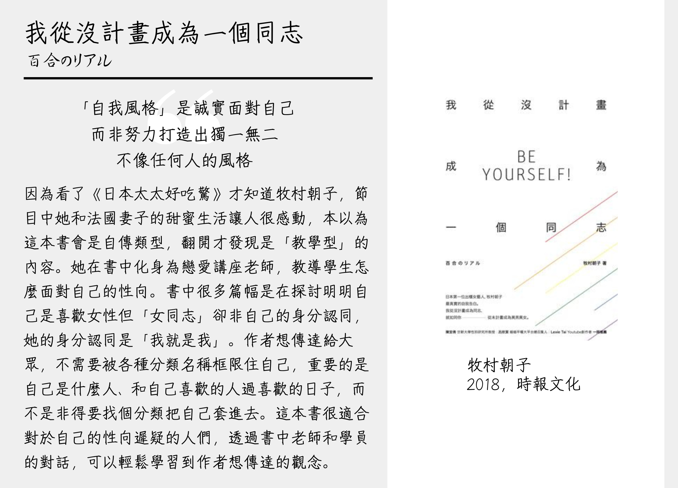 I came to know about Asako Makimura after watching “Sekai no Nihonjin Tsuma wa Mita!" The heartwarming life she shares with her French wife in the program deeply moved me. I initially thought this book would be autobiographical, but upon opening it, I realized it was more of an instructional guide. In the book, Makimura takes on the role of a love seminar teacher, instructing students on how to confront their own sexual orientation. Much of the content explores the dilemma of being attracted to women but not identifying as a “lesbian." Instead, her identity is simply “I am who I am." The author’s message to the public is clear: one doesn’t need to be confined by various labels; what matters is being true to oneself, enjoying life with the people one loves, rather than forcing oneself into a category. This book is suitable for those who may be uncertain about their sexual orientation. Through the conversations between the teacher and the students in the book, readers can easily grasp the concepts the author seeks to convey.