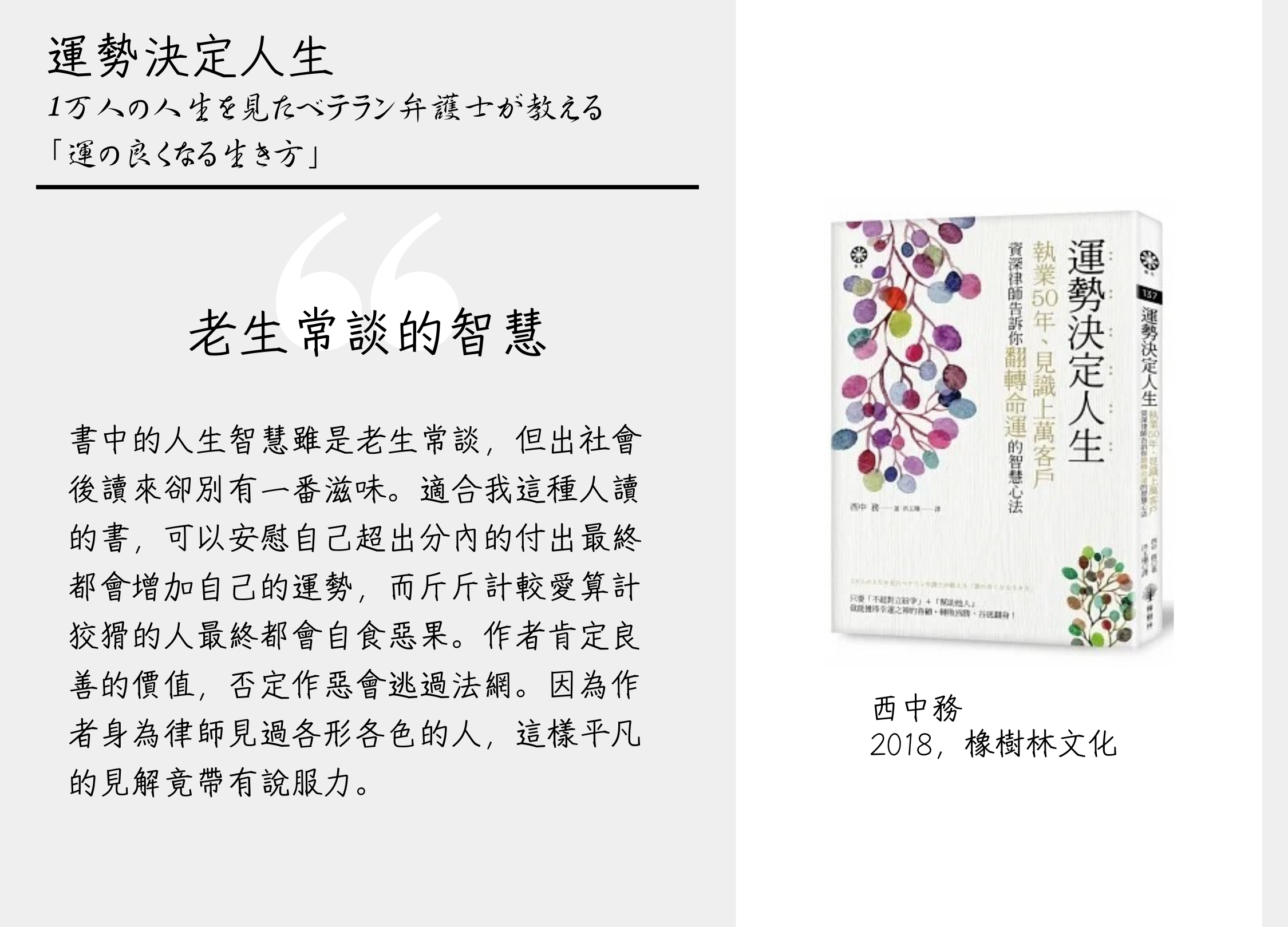 The life wisdom found in the book “How to Improve Your Luck" may seem like old clichés, but reading them after entering society gives them a whole new flavor. It’s the kind of book that resonates with someone like me, offering comfort in the belief that going beyond the call of duty will ultimately enhance one’s luck. Conversely, it warns that those who are overly calculating and deceitful will eventually face the consequences of their actions. The author affirms the values of goodness while refuting the notion that evil deeds can escape punishment. Given the author’s background as a lawyer who has encountered all sorts of people, these seemingly mundane insights carry a persuasive force.