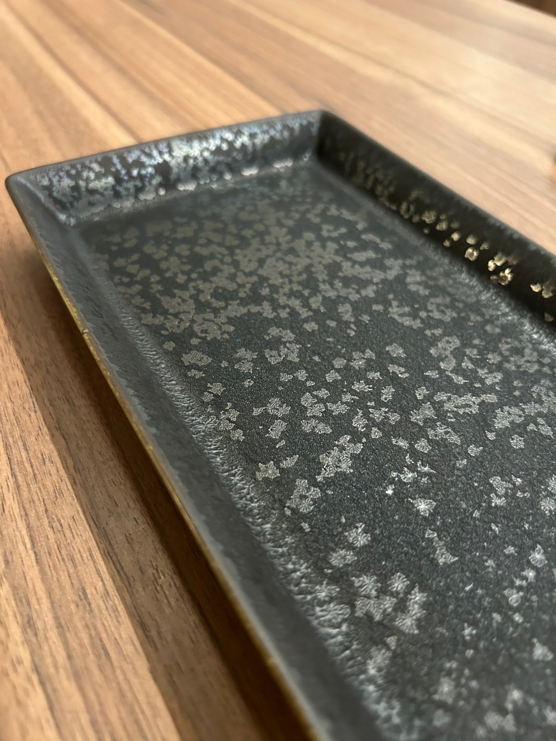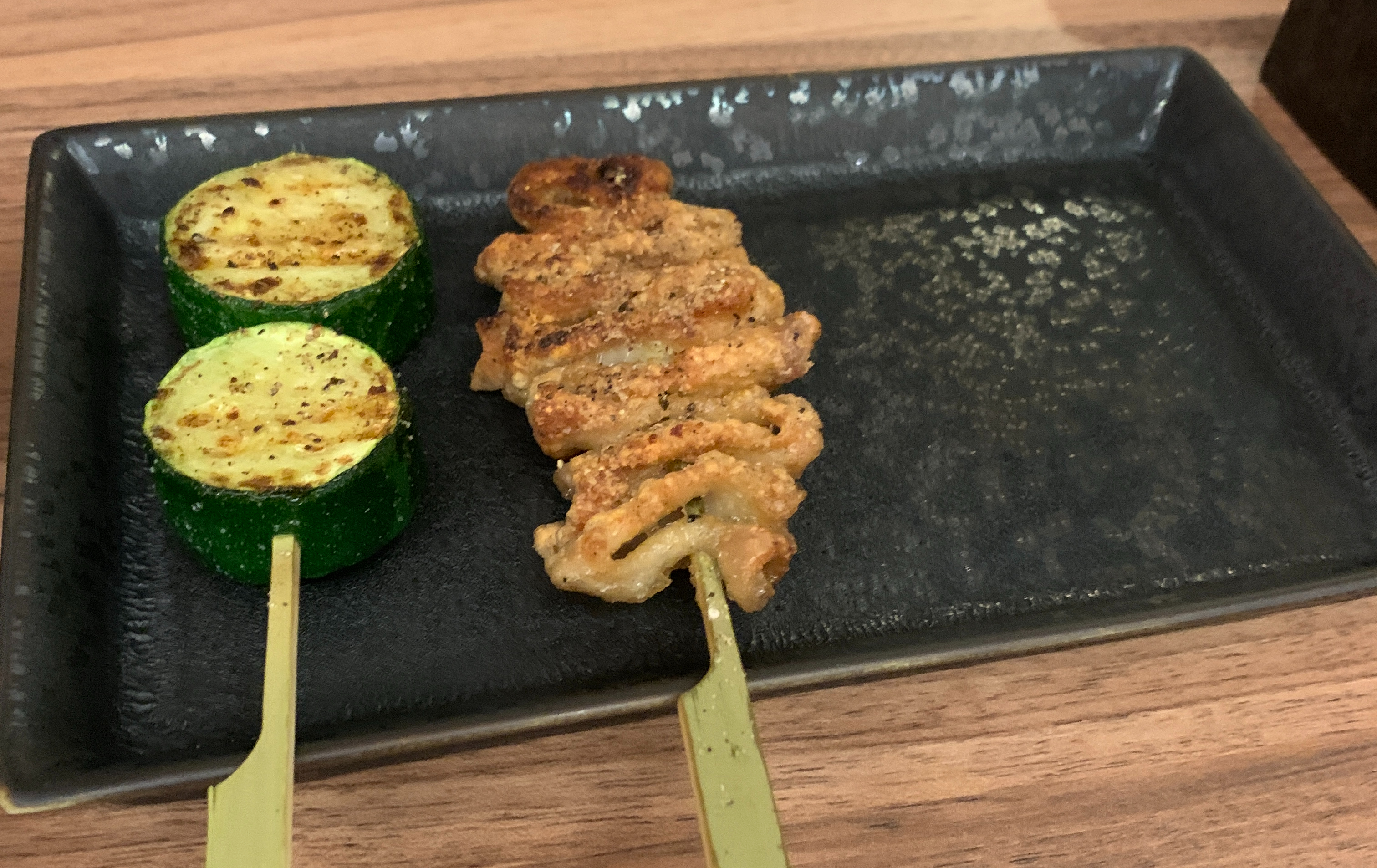 這家店很特別,上菜前桌上就擺著一個黑色盤子,我們一直在想這盤子是有什麼作用,結果等到雞皮和櫛瓜送上來時才知道,原來是公盤啊!